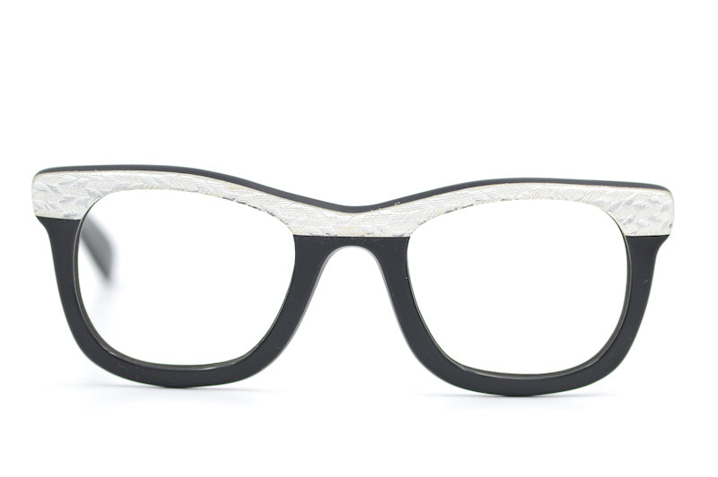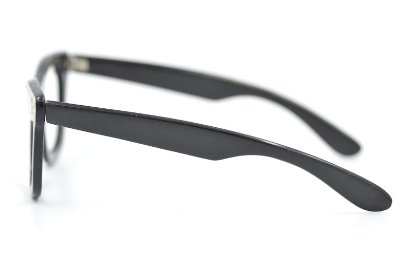 Stand out from the crowd in this original rare 80s wayfarer frame. Made of bold black acetate, the frame has silver shimmer fabric set into the brow. Stylish unisex design that could look great as prescription glasses or sunglasses.