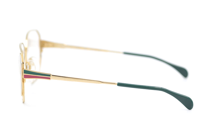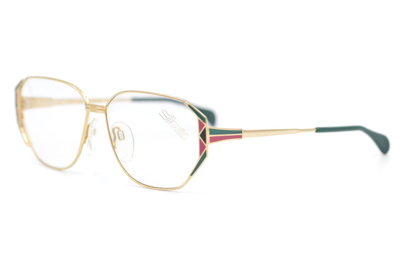 Manufactured in Austria we have Silhouette 6146/20 6021. This gold metal frame features fabulous lacquered detail, in green pink and black. Silhouette are well known for their high quality frames, and fantastic manufacturing techniques. 80s Vintage glasses from Silhouette .