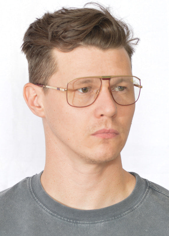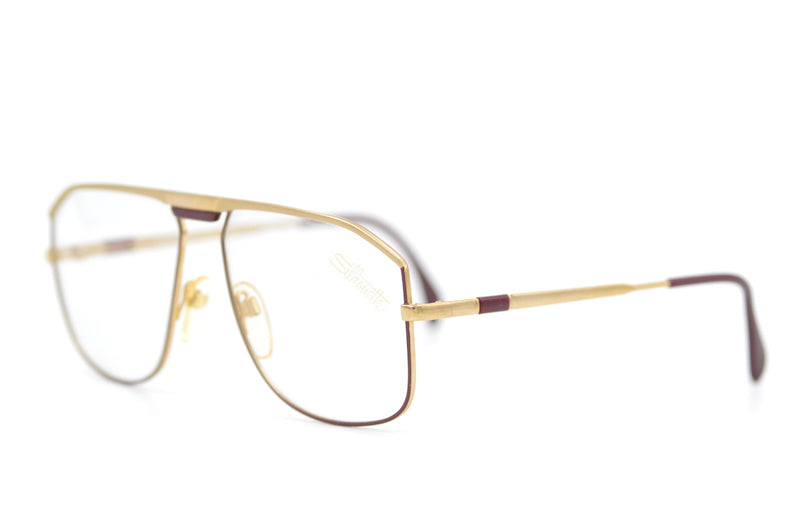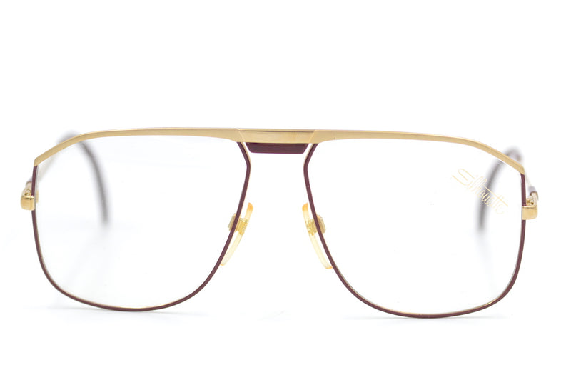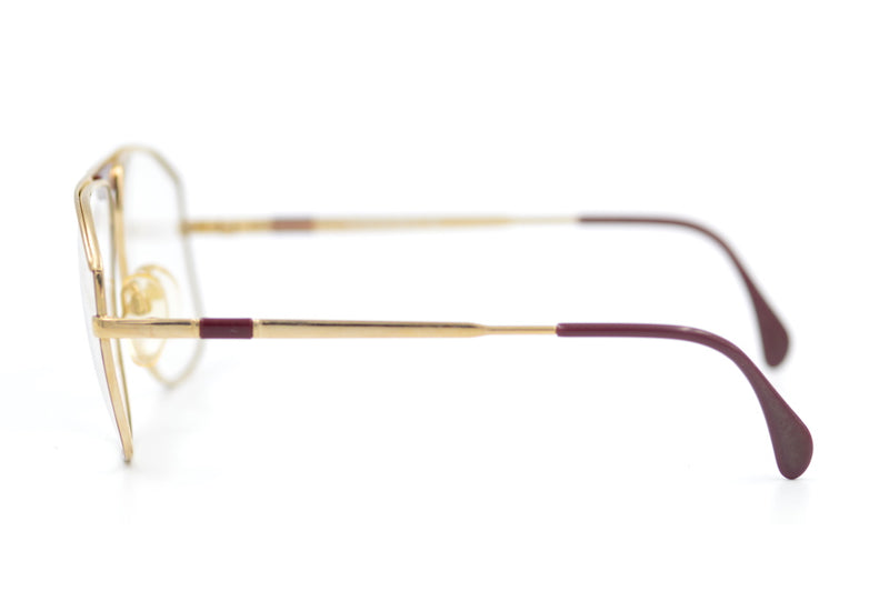 Manufactured in Austria in the 80s we have Silhouette 7064 in colour 4134. New unused vintage frames. This gold metal aviator features deep red detail to the front and temporal sides. A cool retro design, something a little alternative to the traditional aviator.