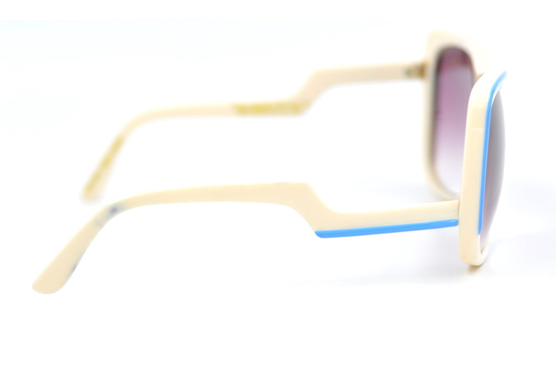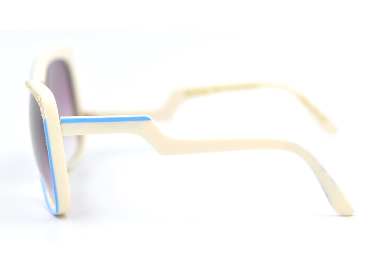 Stand out from the crown in Sirocco Ultra by Brandy vintage sunglasses. This fabulous 80s vintage sunglasses frame is adorned on the right side with diamante and stud detail. A blue line sweeps across the front of the frame. The sides are staggered with the right side low set and the left side high set. The lenses are pinky/purple in colour and have a graduated finish. Elton John style sunglasses. New unused stock, but please note a tiny bit of blue dye on the bridge and a mark on the sides near the ear point, see images. Marks reflected in price.