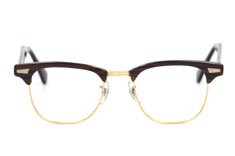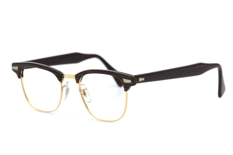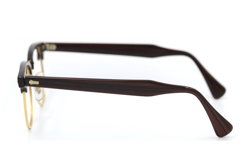 New old stock SR USA Whitney men's vintage glasses frame. In superb condition, this 1960's/70's frame is in excellent condition. The clubmaster brows and temporal sides have a mahogany wood effect. Rivet detailing can be seen to the front and temporal sides. These frames are original new old stock, not to be missed. Prescription lenses available from £29.00.