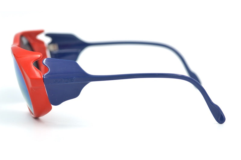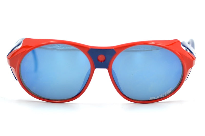 Sunjet by Carrera 5246 30 vintage sunglasses. New old stock, manufactured in Austria in the late 80s. This super cool frame is perfect for winter sports. The frame has a wrap design with side shields, reducing glare. The grey lenses provide 100% UV protection and have a blue mirror coating on the exterior. The combination between the red and navy acetate works really well and the frame is a lightweight and comfortable design. Carrera launched the Sunjet range in 1986.