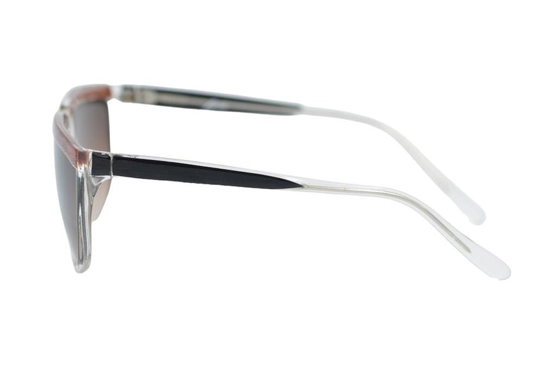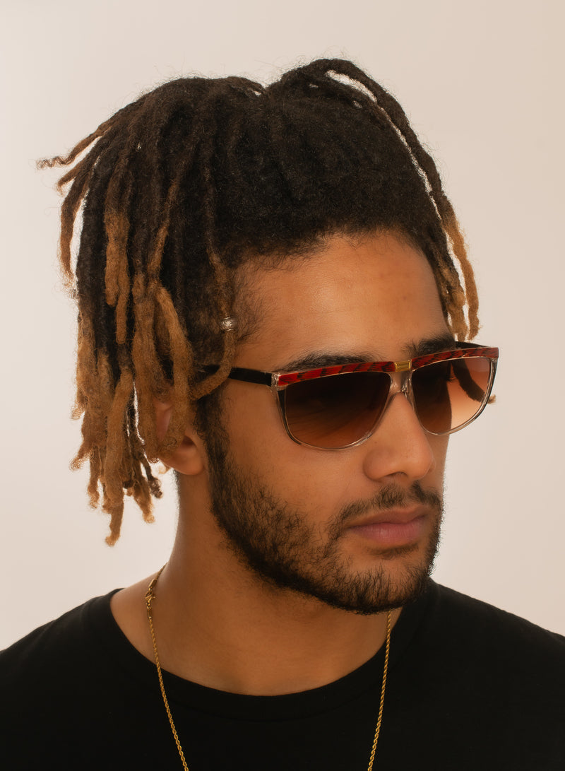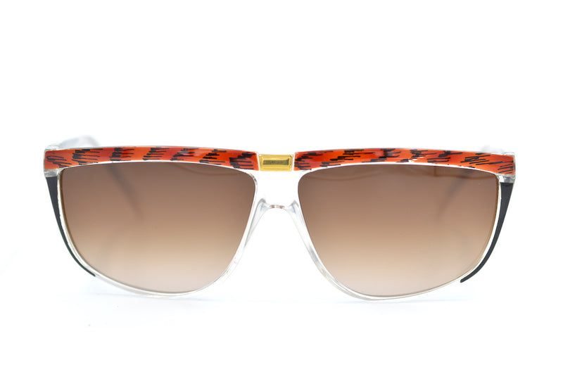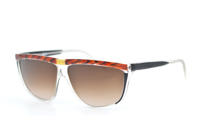 Manufactured in Italy we have these new old stock Sybille 387 vintage sunglasses. This acetate frame features a mix of black brown and crystal. Gold metal detail can be seen on the bridge. Brown graduated lenses provide 100% UV protection. Original retro sunglasses from the 80s.
