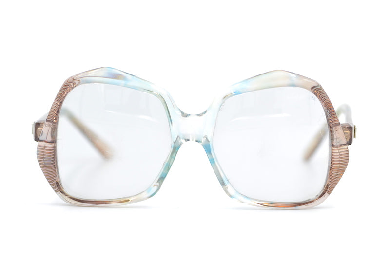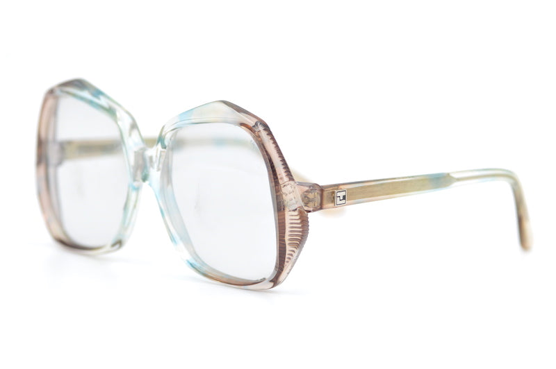We are obsessed with Ted Lapidus 531 70s vintage glasses frames. Handmade in France, this stunning rare frame, is a super cool oversized shape. The acetate features a pale blue and brown mottled finish. The back temporal edges are engraved to give a textured look to the front. The temporal sides feature the Ted Lapidus emblem. You wont find a better example of 70s glasses than this. Available in red and brown. Comes with original packaging.