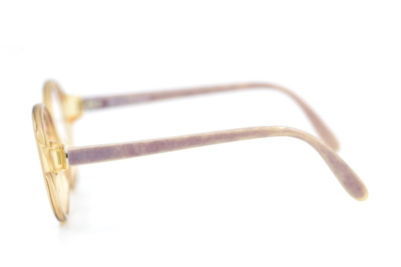 Terri Brogan 8658 81 vintage glasses. This petite frame has a soft round shape, in transparent pale brown acetate with mottled temporal sides. Made of Optyl, this is a lightweight durable frame. Manufactured in Austria in the 80s. Stylish, sustainable petite glasses at Retro Spectacle.
