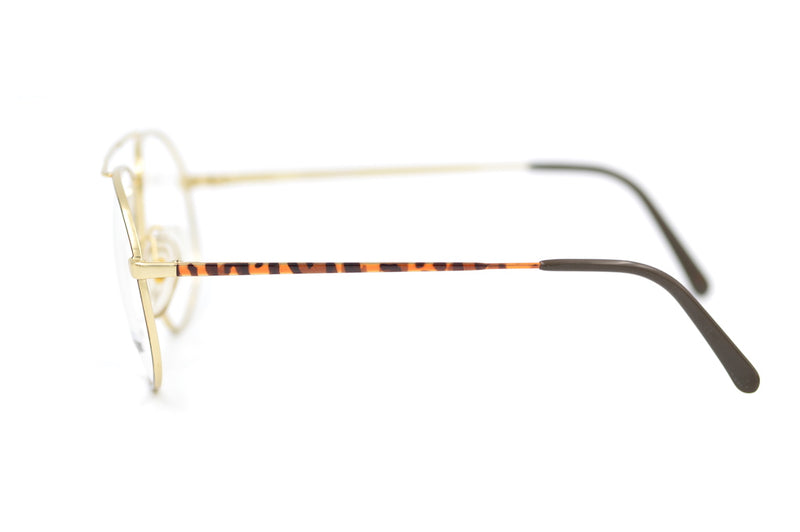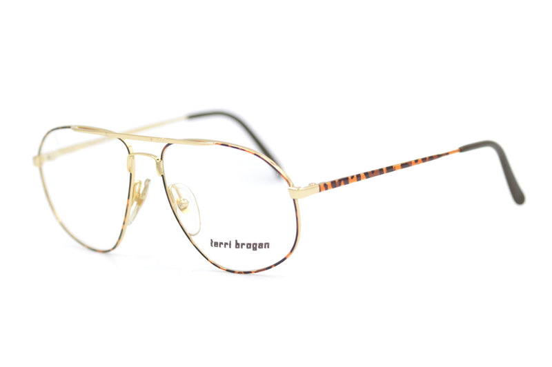 • New old stock Terri Brogan 8845 vintage aviator glasses in colour 41. This original vintage frame dates back to the 1980's. It is a more rounded version of the 8830 by Terri Brogan. This gold metal frame features brown mottled front rims and plain brown temporal tips. The aviator shape makes this perfect as Custom glasses or sunglasses. A traditional gent's style that is becoming more unisex. High quality sustainable eyewear.