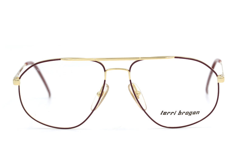 New old stock Terri Brogan 8845 vintage aviator glasses in colour 43. This original vintage frame dates back to the 1980's. It is a more rounded version of the 8830 by Terri Brogan. This gold metal frame features red front rims and temporal tips.. The aviator shape makes this perfect as Custom glasses or sunglasses. A traditional gent's style that is becoming more unisex. High quality sustainable eyewear.