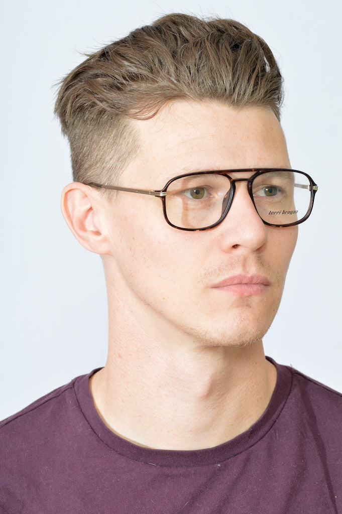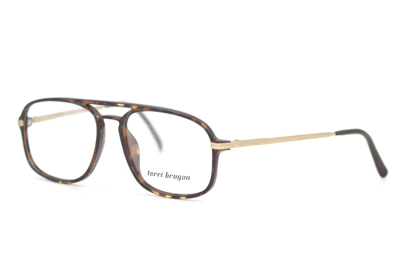 New old stock Terri Brogan 8968 in colour 11. This combination frame features an acetate front in a matte brown mottled finish. The temporal sides are matte gold. Manufactured in Austria in the 80s this stylish frame is lightweight and comfortable. The brow bar and keyhole bridge add a sophisticated touch to this frame.