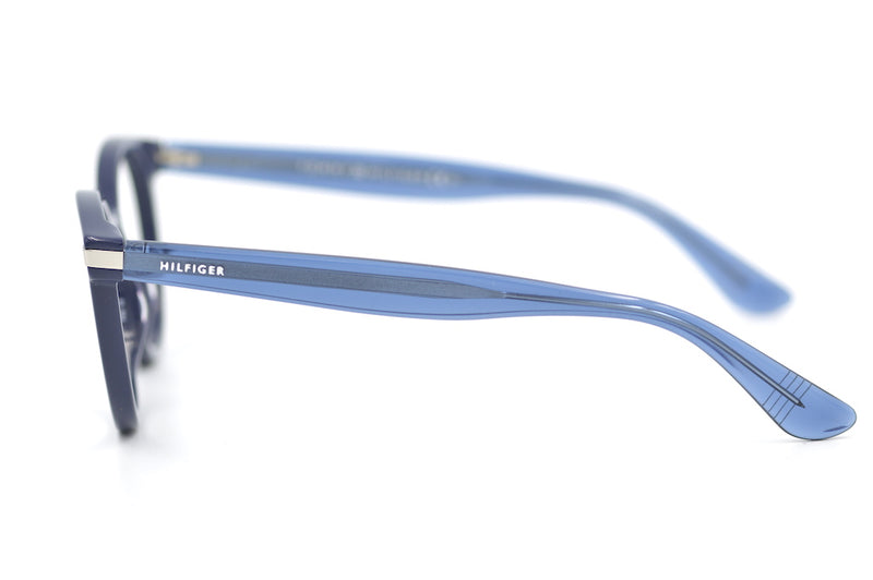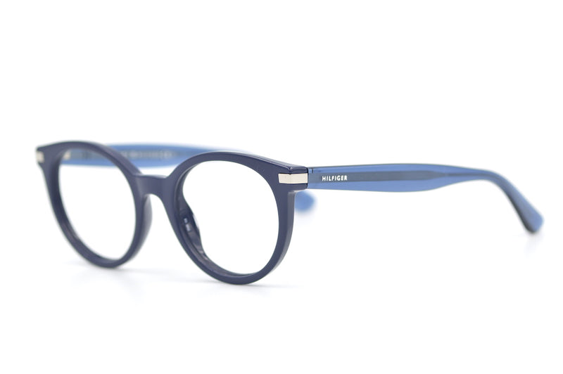 Tommy Hilfiger 1518 retro glasses. Bold blue acetate makes creates a strong look. The frame is finished with silver detail to the front temporal edge and the Hilfiger signature on the temporal sides. Frame is in excellent condition with very little sign of wear. Affordable sustainable eyewear at Retro Spectacle.