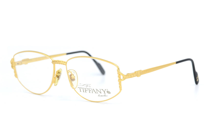 Tiffany 342 vintage glasses in colour 4. This 23KT gold plated frame was handcrafted in Italy using the highest quality materials. Chain detail is present to the bridge and the temporal sides have the Tiffany branding. This frame is in magnificent condition, it comes with the original case, cloth and display box, also included are spare nose pads, screws and temple tips. A luxurious pair of vintage glasses for the discerning gent.
