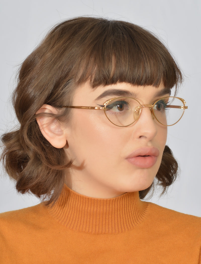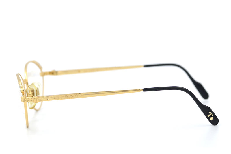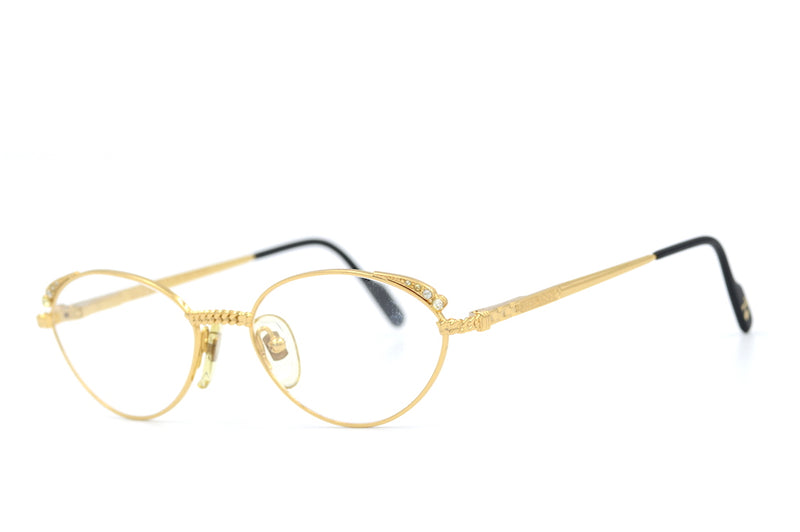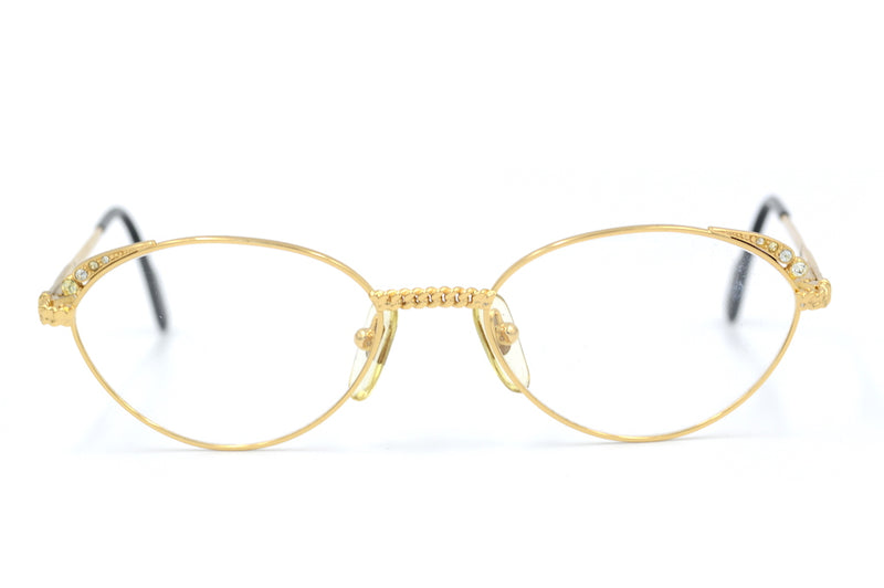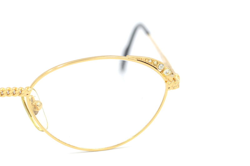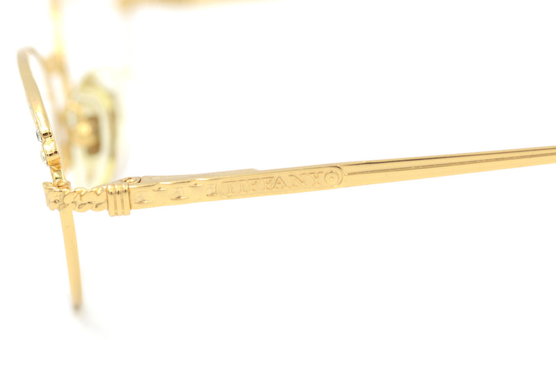 New old stock Tiffany 414 vintage glasses in colour 4. This 23KT gold plated frame was handcrafted with the highest quality materials. Chain detail is present to the bridge and the top rims feature diamanté detailing. All diamantés are present. This frame is in magnificent condition, it comes with the original case, cloth and display box, also included are spare nose pads, screws and temple tips. The temporal sides and tips feature the Tiffany branding. A luxurious pair of vintage glasses.