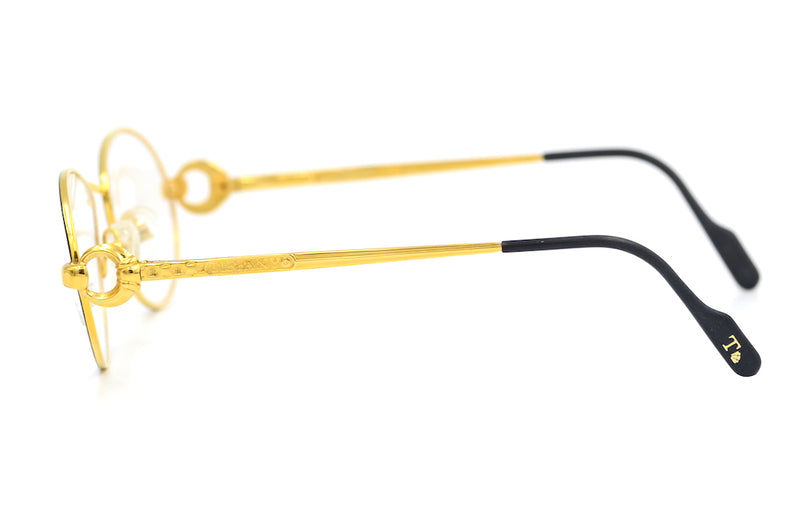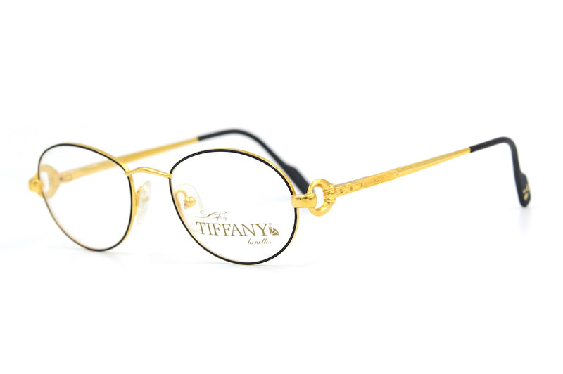 New old stock Tiffany 595 vintage glasses. This stunning rare frame is 23KT gold plated, manufactured to the highest standards in Italy. The front rims are finished in black, but the detail is all about the side. A bold and eye catching circular design links to the, Rolex link pattern and Tiffany branding. The frame comes with the original case and packaging, along with spare nose pads, temple tips and screws.