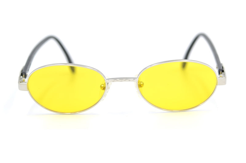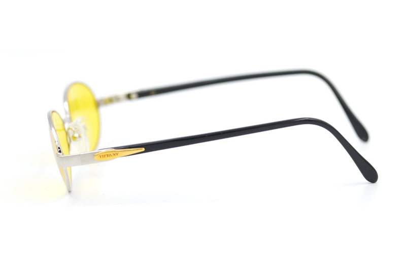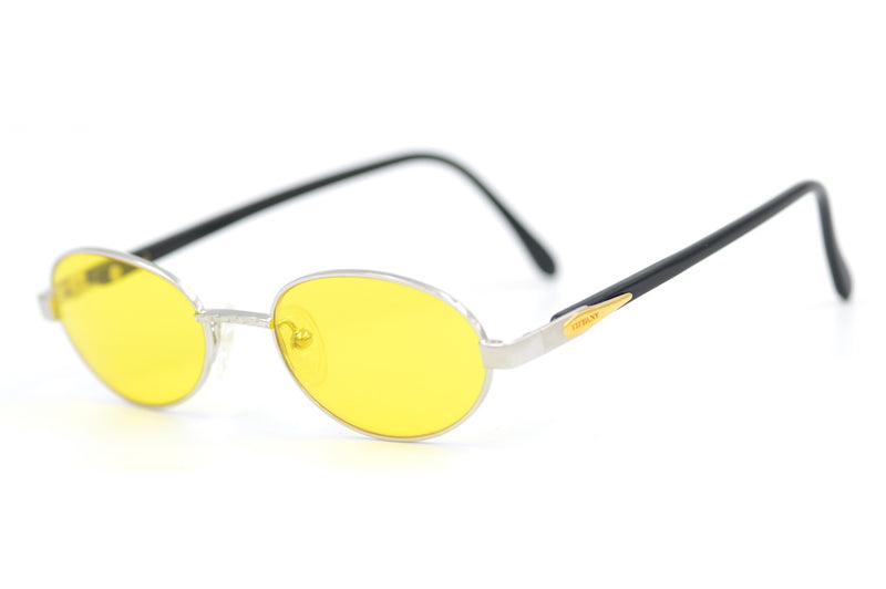 Tiffany Lunettes T665 vintage sunglasses in colour 11. This platinum plated frame was handcrafted with the highest quality materials. The frame is in magnificent condition, it comes with the original case, cloth and display box, also included are spare nose pads, screws and temple tips. 100% UV protection. A cool 90s oval shape with fabulous yellow tinted lenses. The temporal sides and tips feature the Tiffany Lunettes branding. Designer yellow tinted sunglasses.