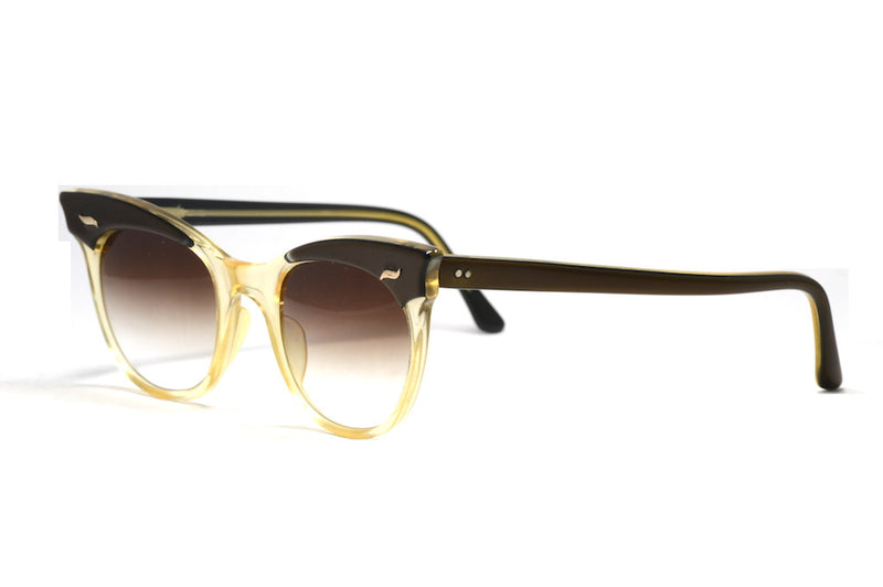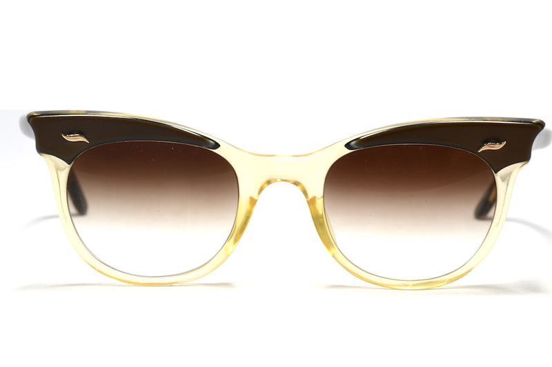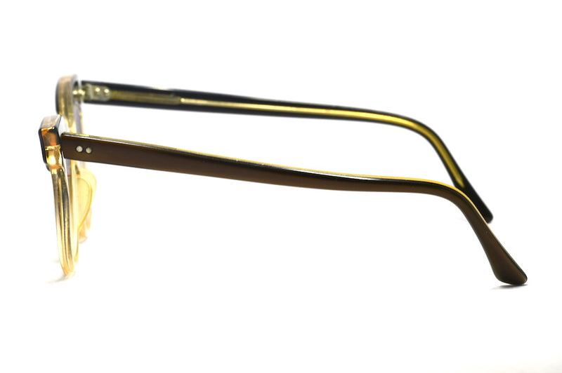 Step out in style this summer with this fabulous bespoke 1960's vintage sunglasses frame. We have customised this original vintage frame by fitting CR39 brown graduated sunglasses lenses with full UV protection. The brown up sweep features the delicate gold detailing and the bridge and lower rim is crystal acetate. The brown acetate sides are reinforced and feature two pin head rivets to the front. This one of a kind sunglasses frame would also be suitable for prescription sunglasses lenses. The frame is in excellent vintage condition.