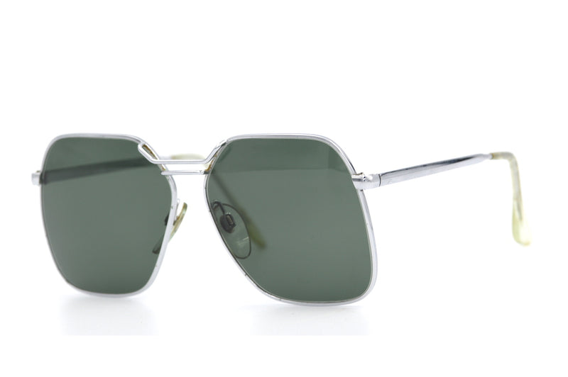 Oversized vintage square aviator sunglasses at Retro Spectacle. This silver polished frame is in excellent condition and has been fitted with new G15 lenses which absorb 85% of light and have 100% UV protection. The frame has a double bridge bar for strength and style. The temporal sides are high set on this lightweight frame. Manufactured in England, sustainable stylish sunglasses.