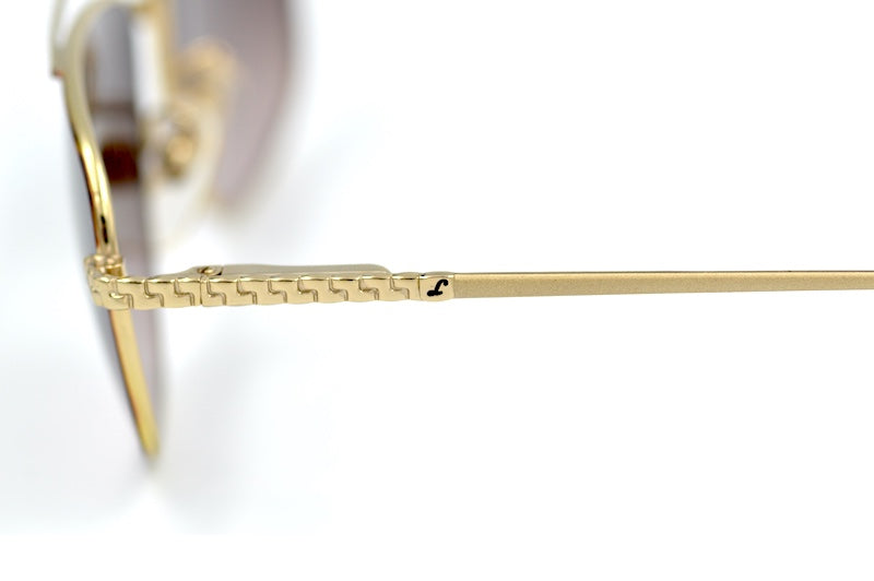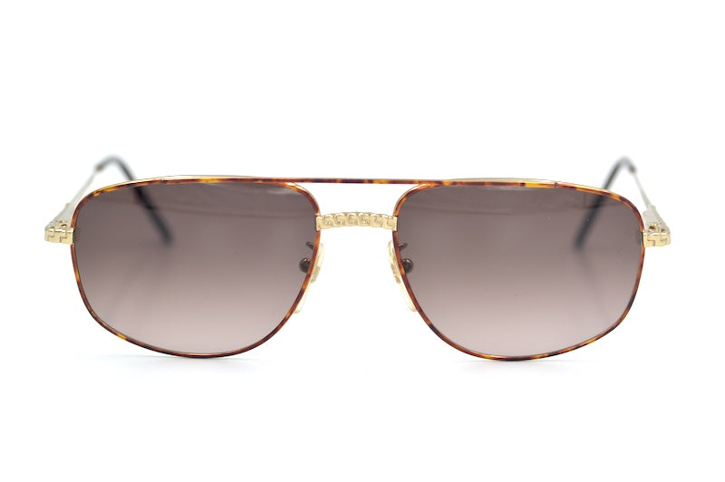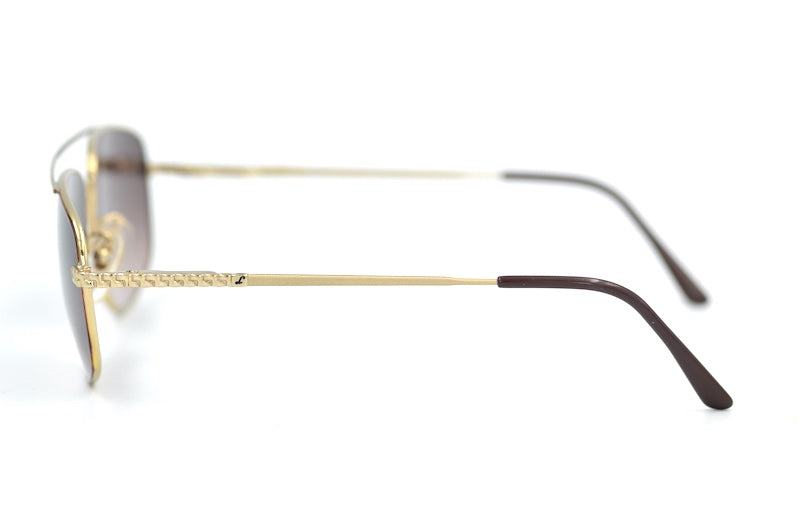 Only one available - Tonino Lamborghini 013 vintage designer sunglasses. These stylish 90s sunglasses are rectangular in shape. The front brown mottled rims are complemented by the gold bridge and sides with ornate jewellery like detail and a small black L emblem on each side Similar in shape to the S.T Dupont D002 worn by Brad Pitt in the F1 movie. Brown graduated lenses provide 100% UV protection. Made in Italy.