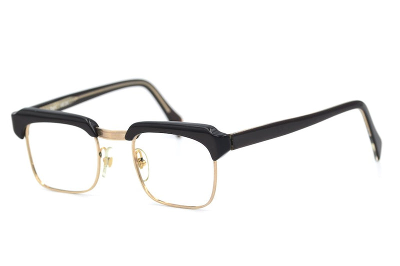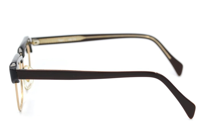 New old stock Merx UK Trent, in brown acetate and gold filled metal. Fabulous vintage browline glasses.The gold has a pale, almost rose gold finish to it. The inside bridge is stamped with the markings 1/20 10CT. A very stylish frame in superb condition. Original, authentic frames from the 1950's not to be missed, manufactured in England. Simple yet stylish. Prescription lenses available from £29.00.