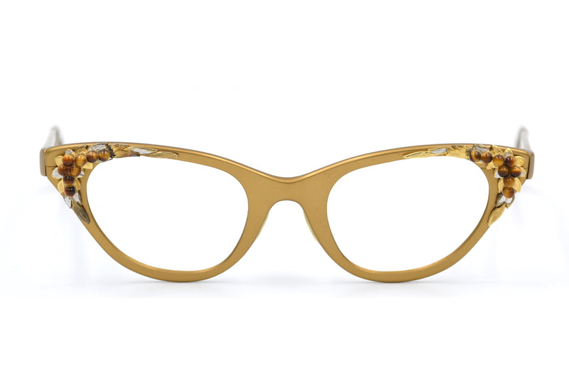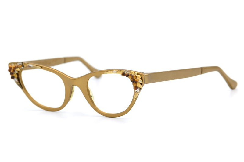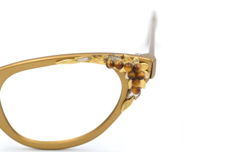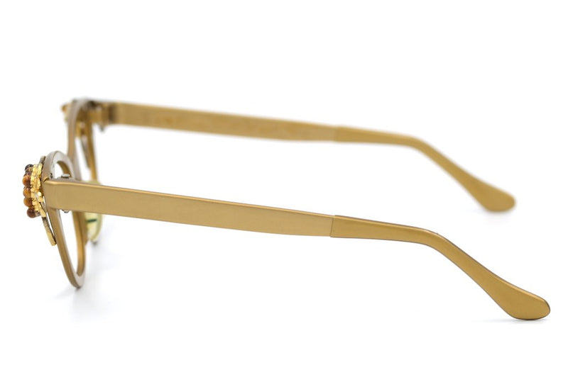 Tura Godiva Petite is a new old stock aluminium frame manufactured in the USA. This original vintage 1950's cat eye glasses frame is a stunning frame. The bronze matte finish aluminium is decorated with metal and bead detailing to the front temporal edge.. This frame is petite, so please check measurements against your existing frames before ordering. Prescription lenses available from £29.00.