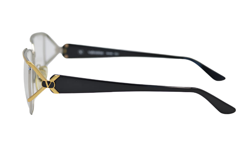 Valentino 343 vintage glasses. Manufactured in Italy in the 80s. Cool unisex design. Silver metal front with gold brows and black acetate sides. The sides feature the Valentino emblem. New unused vintage glasses. Shop stylish glasses online at Retro Spectacle .