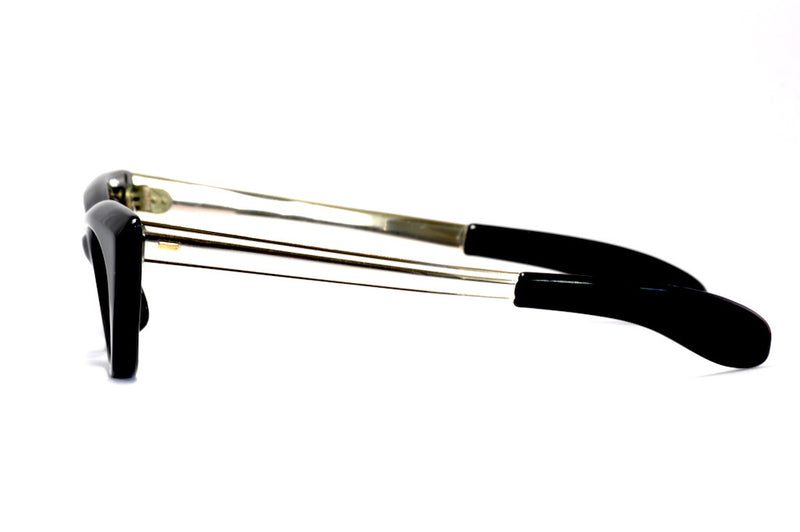 - Ladies 1960’s Cat Eye Vertex vintage glasses, with light gold broad skull grip sides. This classic cat eye design is in black acetate, the rims are thick giving maximum effect. The sides are supported by 5 charniers adding strength and a rectangular rivet to the front of each side adding detail. The frame is a fixed pad bridge. These frames are in very good condition for a vintage product.