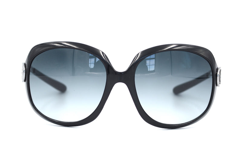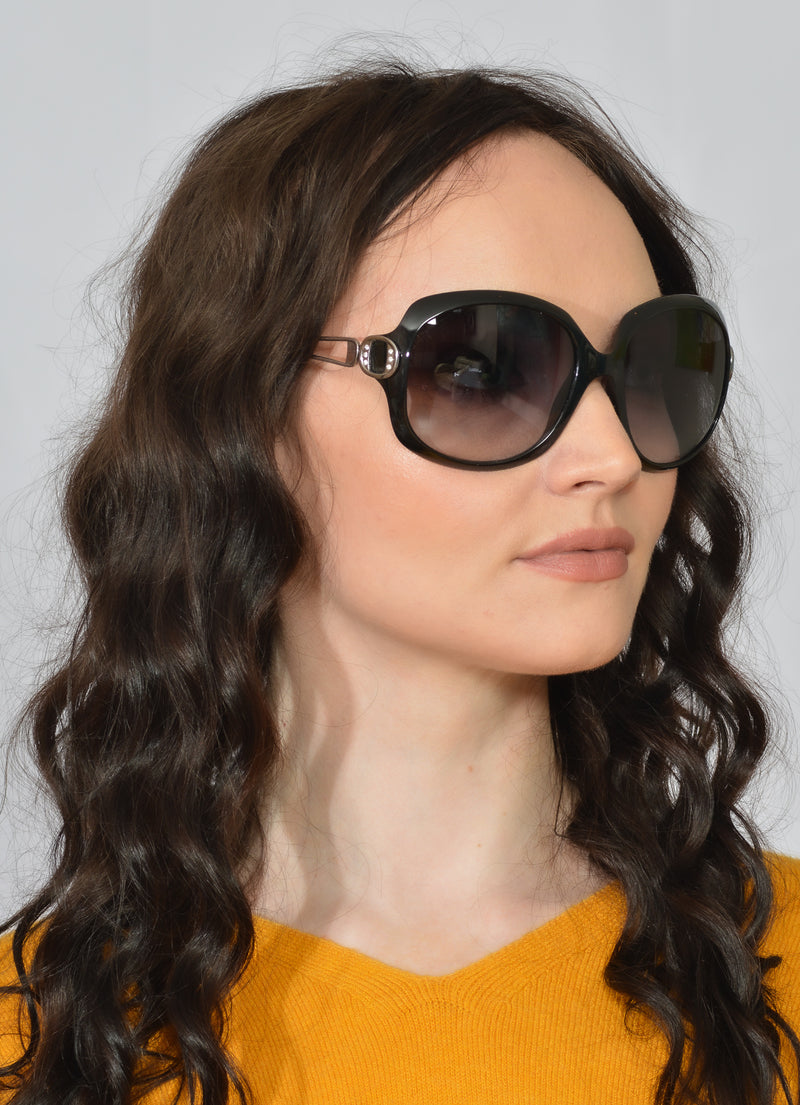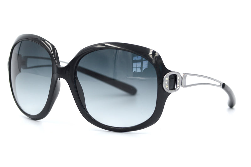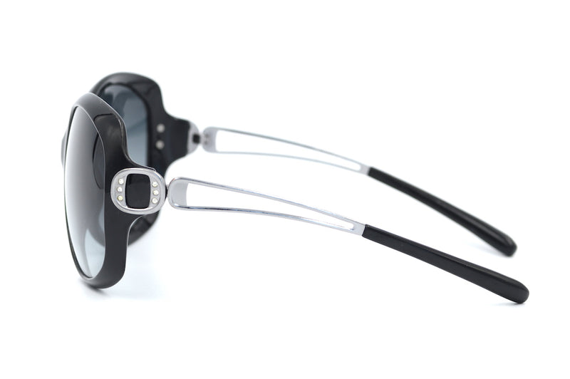 Handmade in England by a master craftsman, we have Victoria, a new old stock vintage sunglasses frame. This oversized sunglasses frame features an acetate black front with a fixed bridge, and silver metal skull grip temples which feature a little diamanté detailing. The lenses are grey, graduated and have UV400 protection. A stylish pair of new old stock sunglasses not to be missed. Custom lenses may be available on request, dependent on the Custom, due to the size of the frame.