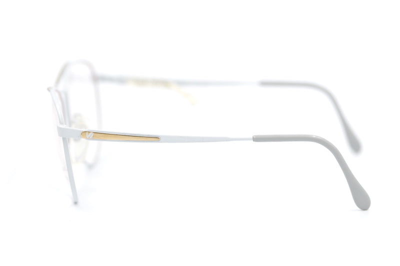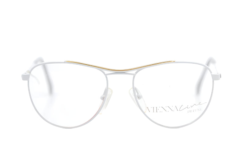 New old stock ViennaLine 1416 20 vintage glasses. Super cool feminine aviator glasses in white metal, with gold detail to the brow and temporal sides. New unused vintage stock. Petite/ small side. A great way to get the oversized style in a smaller frame.