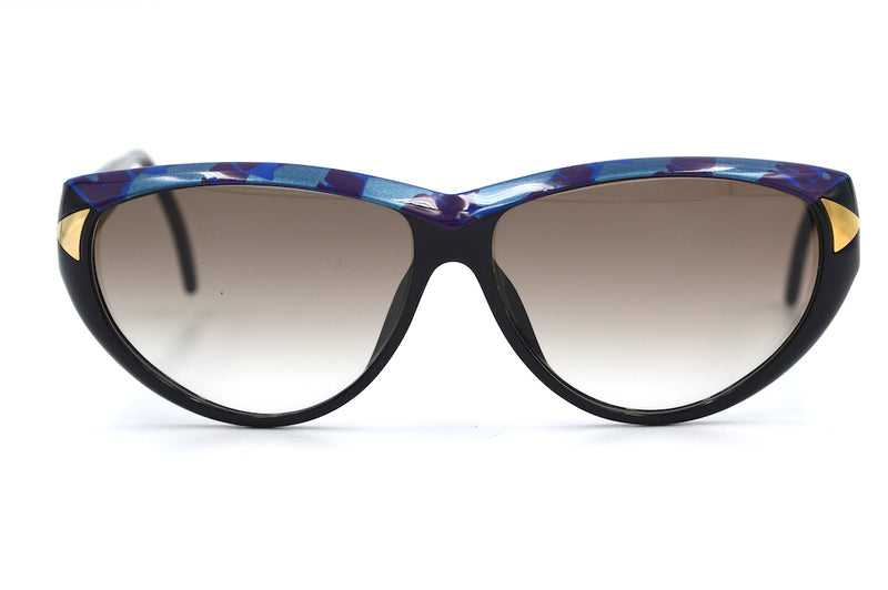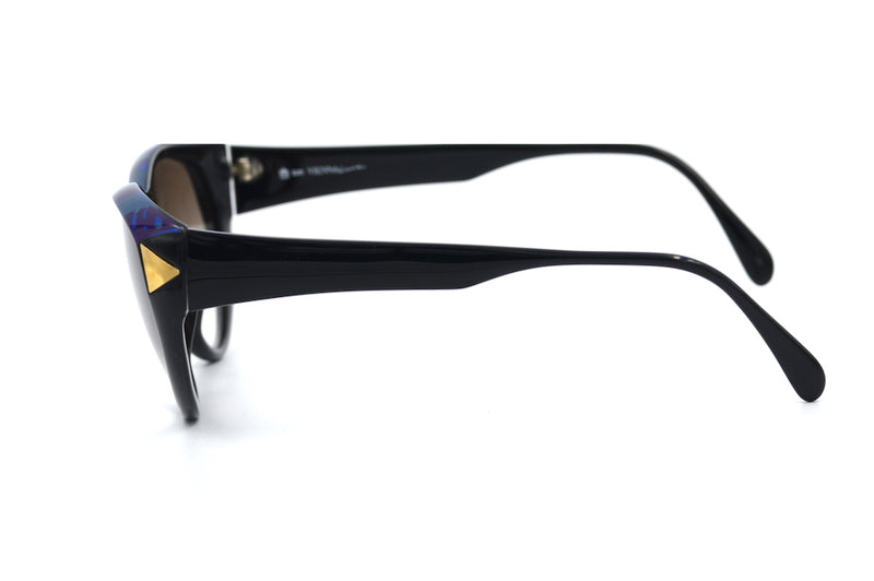 New old stock ViennaLine 1697 vintage sunglasses in colour 50. This black polished frame is made of Optyl, a lightweight, durable and hypoallergenic material the cat eye shape is highlighted with gold metal detail to the temoral edge and a blue and purple brow, very 80's. The brown lenses are graduated and have 100% UV protection. ViennaLine was founded in the 1950's by William Anger. A brand that's styles remained elegant and timeless across the decades.