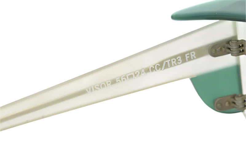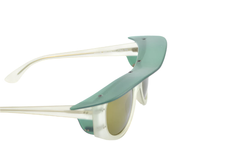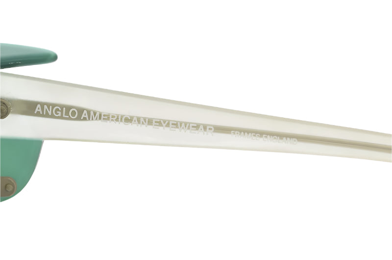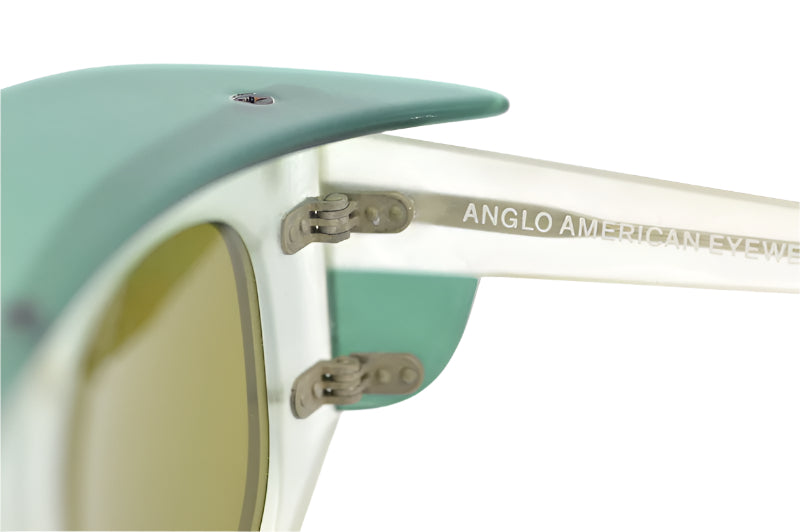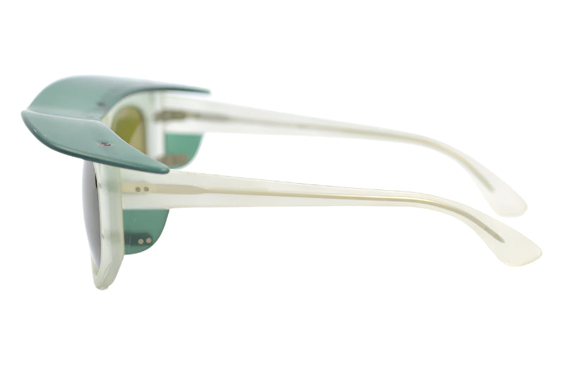 One of the coolest, functional and stylish frames we have come across. Visor by Anglo American Eyewear. Part of the Fantasy collection that started in the 70s. This Elton John-Esque frame is very unique. A crystal frosted acetate front and temporal sides are brought to life with the green visor top and side detail. The temporal sides are mounted in two points either side giving nice rivet head detail and super strength. The sun lenses are brown in colour. This is a true collectors rare vintage sunglasses frame.
