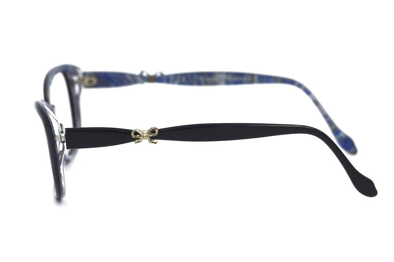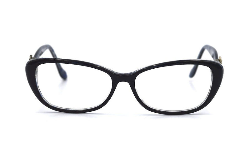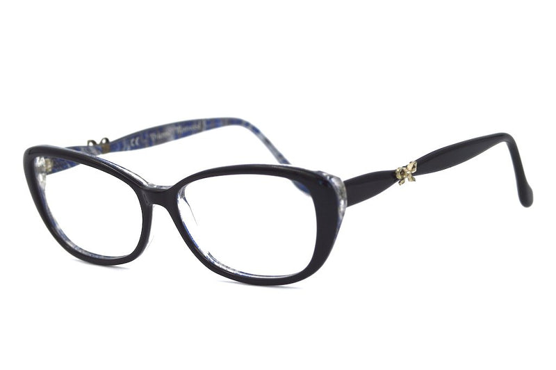 Vivienne Westwood 024 in colour S26. Manufactured in Italy this new old stock retro inspired frame is one to watch. The black acetate is cat eye in shape and features silver bow detailing to the temporal sides. Prescription lenses available from only £29.00.