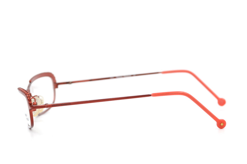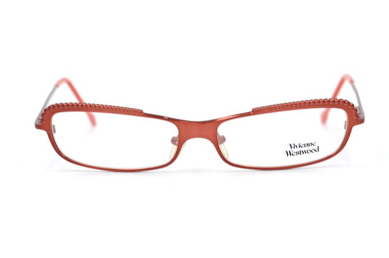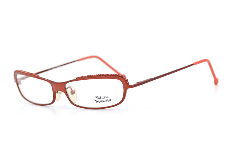 New old stock original Vivienne Westwood 02904 glasses in red. This frame is perfect for reading glasses, due to its narrow shape, allowing the wearer to peer above. This frame is not suitable for varifocals. The Vivienne Westwood signature is on the very fine temporal sides. The only tiny flaw with this frame is the small paint chip on the top right rim (see frontal image), however this in no way affects the wearability of the frame, and can only be seen from above. Sustainable designer glasses, not to be missed. .