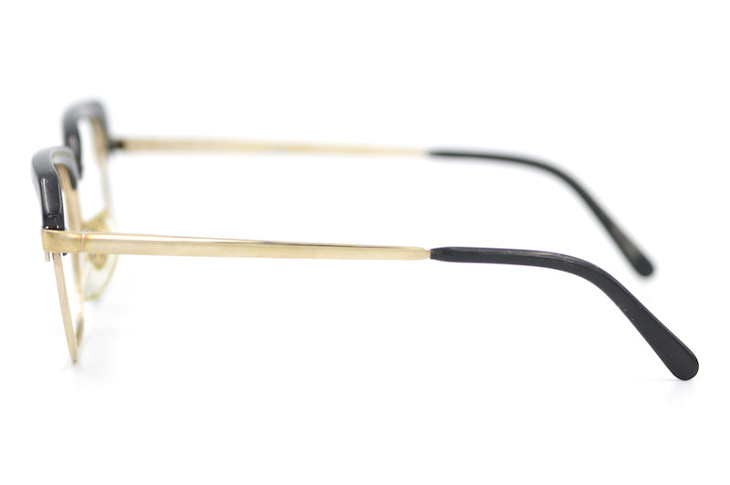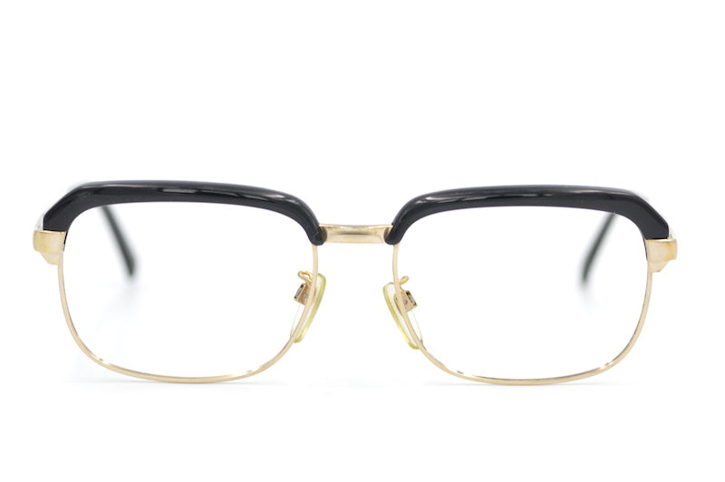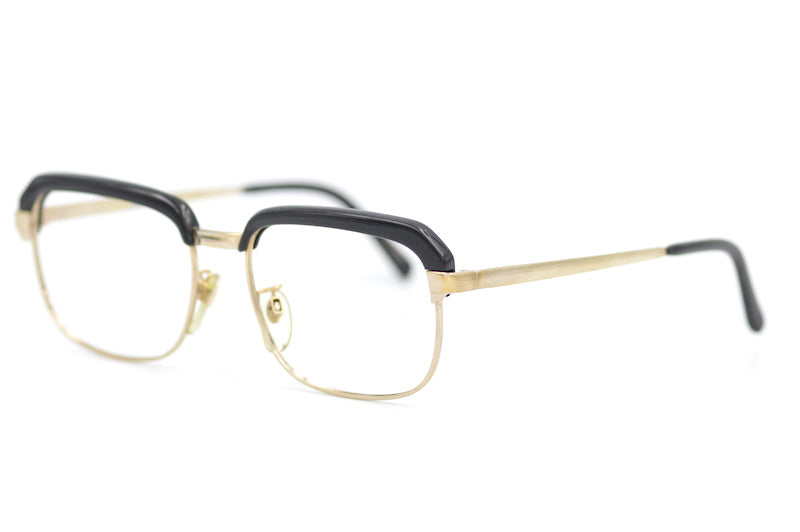 Get the Kray look with this original mens 60s vintage glasses frame. Engraved YNC on the bridge, this cool vintage frame is guaranteed to please. The polished gold metal frame features black acetate brow covers, which were a popular style. Great refurbished vintage condition, with little sign of wear.
