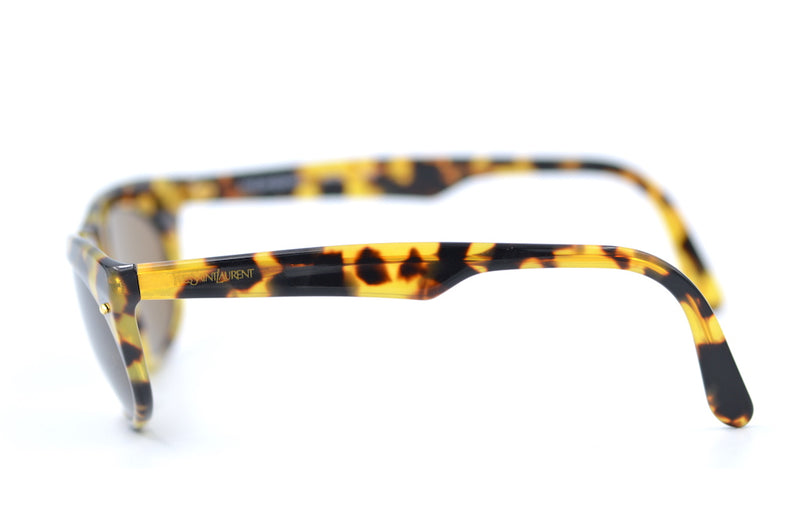 Only one in stock - authentic new old stock Yves Saint Laurent 6504 vintage sunglasses in colour Y529. A timeless 1990s Italian-made design, this frame features a shallow mottled acetate construction with elegant subtle gold rivet detailing on the front temporal edges. The brown lenses provide 100% UV protection, combining style and function in classic YSL fashion. The gold YSL branding on the temples completes the sophisticated look, embodying the understated luxury of Yves Saint Laurent eyewear.