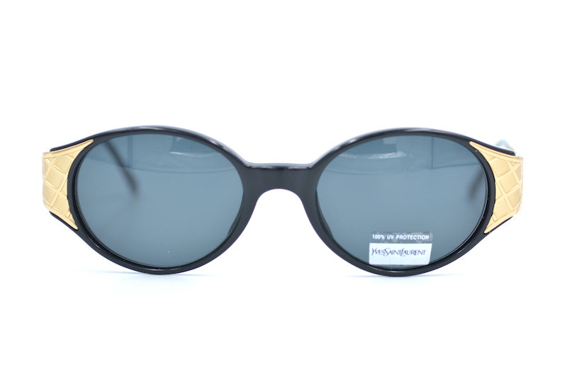 New old stock Yves Saint Laurent 6547 vintage sunglasses in colour Y505. This rare vintage frame was manufactured in Italy and dates back to the 80s. The oval shaped black acetate front features stunning gold edging and temporal sides. Grey lenses offer 100% UV protection. Manufactured in Italy. Supplied with original case and packaging. Shop the best selection of YSL sunglasses online at Retro Spectacle.