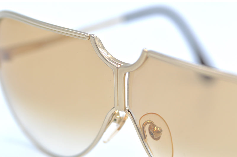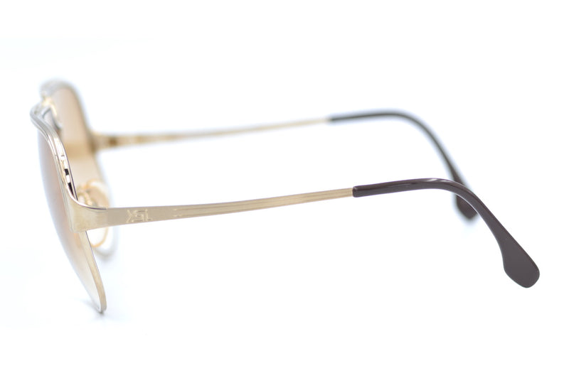 Step out in style in vintage Yves Saint Laurent 30-3101 sunglasses. This oversized vintage sunglasses design has a real 70s vibe and features a mix of polished and matte gold metal. The bridge is packed with detail and the temporal sides feature the YSL branding. Golden brown graduated lenses provide 100% UV protection.