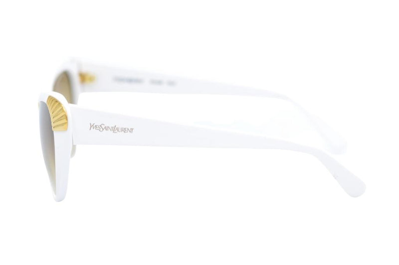 Stand out from the crown in Yves Saint Laurent 5014 vintage sunglasses in colour Y555. One of our favourite YSL vintage sunglasses, perfect for all you cool cats and kittens. A strong cat eye shape, this shape is emphasised with gold metal detail to the bridge and brow. Gorgeous white acetate houses the brown graduated lenses. 100% UV protection. The temporal sides have the Yves Saint Laurent signature in gold. Rare vintage sunglasses from YSL.