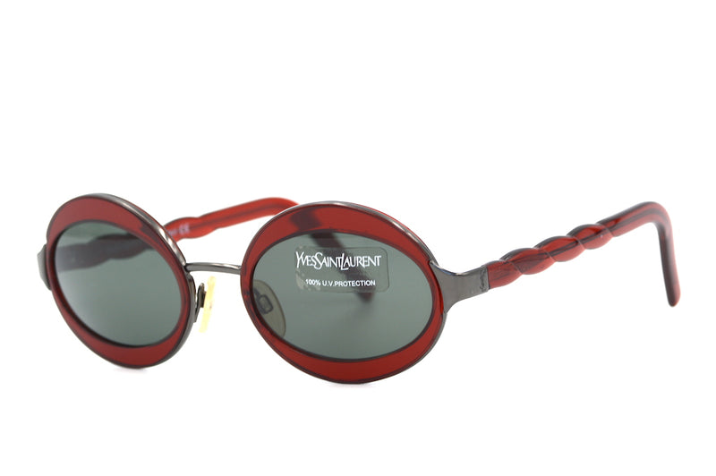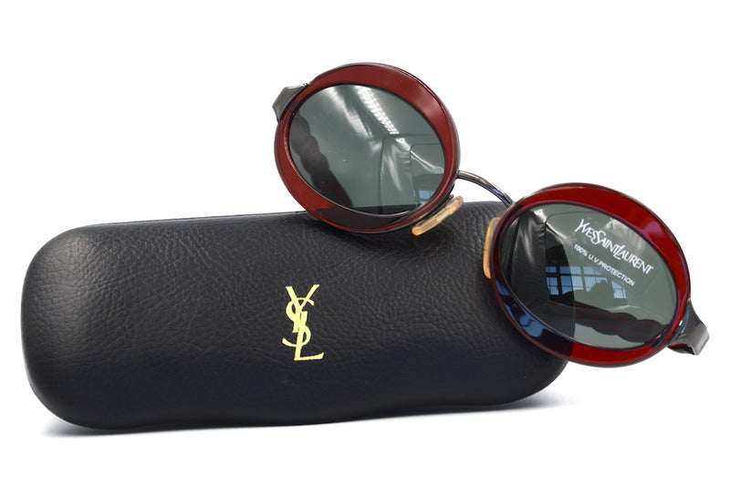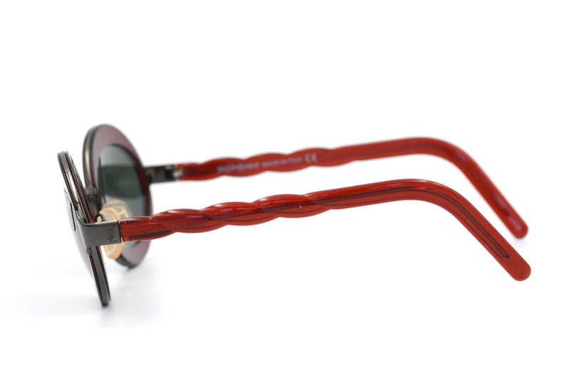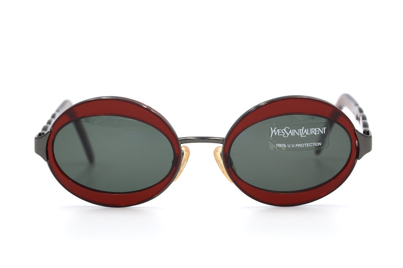 Only one of these rare vintage frames is available. New old stock, with original case and tags we have Yves Saint Laurent 6058 vintage sunglasses in colour Y362. This polished dark steel metal frame features red transparent acetate rims and temporal side covers. The temporal sides have rope detail. Stylish, unisex, sustainable sunglasses in superb condition with original case and tags. The lenses have 100% UV protection. Manufactured in Italy, Custom lenses available.