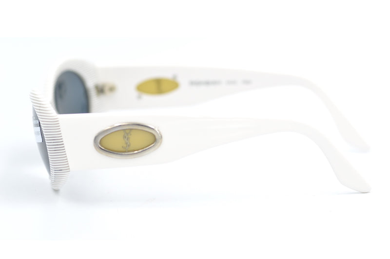 New old stock, Yves Saint Laurent 6554 Y741 vintage sunglasses. A striking petite pair of designer sunglasses in white acetate with a crystal striped front. Grey lenses which provide 100% UV protection. Chunky white temporal sides offer good peripheral protection and feature the YSL emblem. Manufactured in Italy in the 90s. This frame comes with original case and packaging.