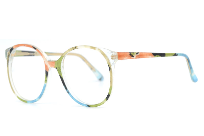 New old stock Zoe by Brulimar in colour 2207. This is most definitely one of our favourite Zoe colour-ways. Silk fabric is layered under the acetate, with greens, blues and peach making it versatile. This 1980's oversized vintage frame is on trend and available in a variety of colours. Please note that due to the fabric layer in this frame, the pattern can differ between frames.